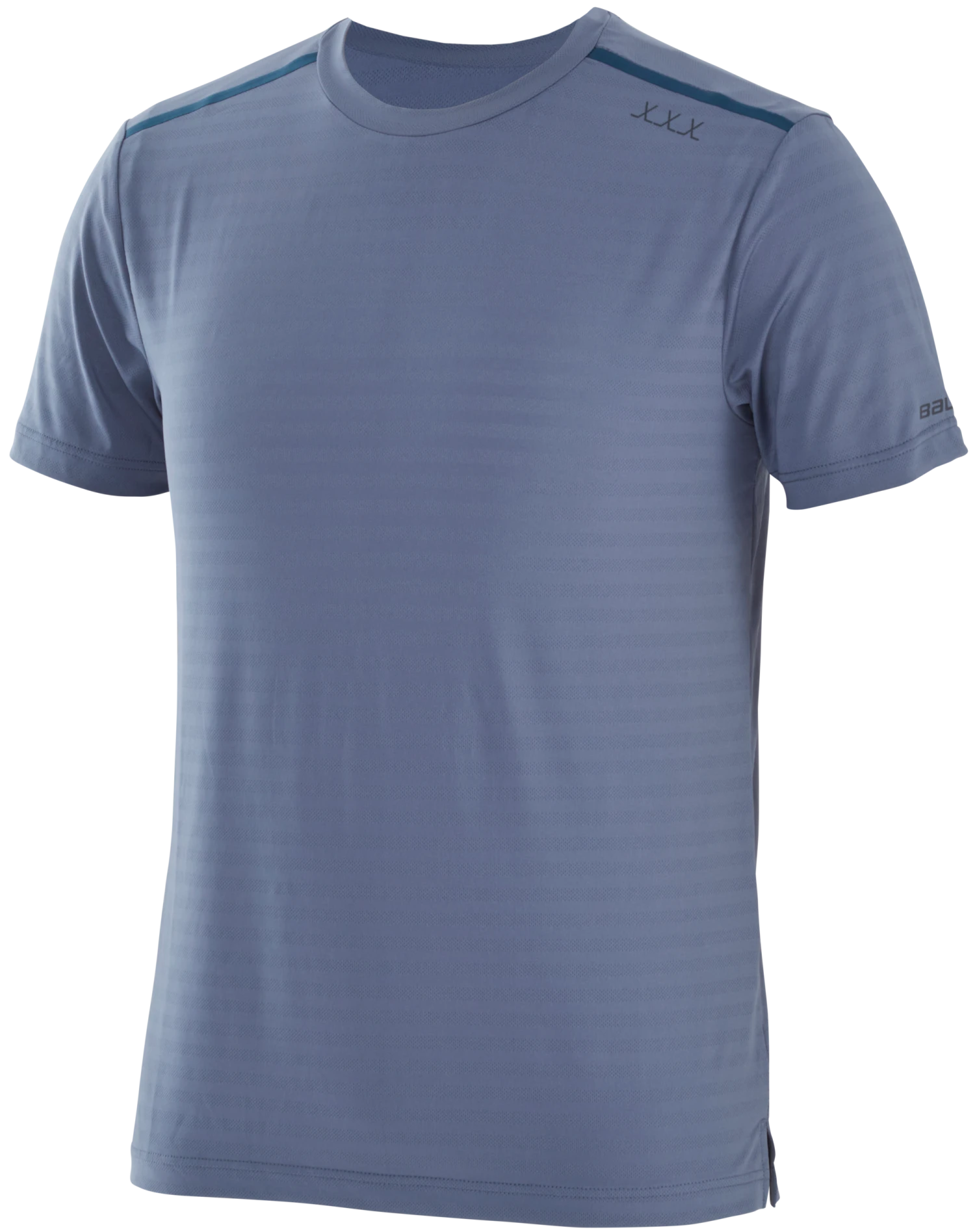 BAUER heat transfer at left sleeve hem; Triple Sticks heat transfer at left shoulder