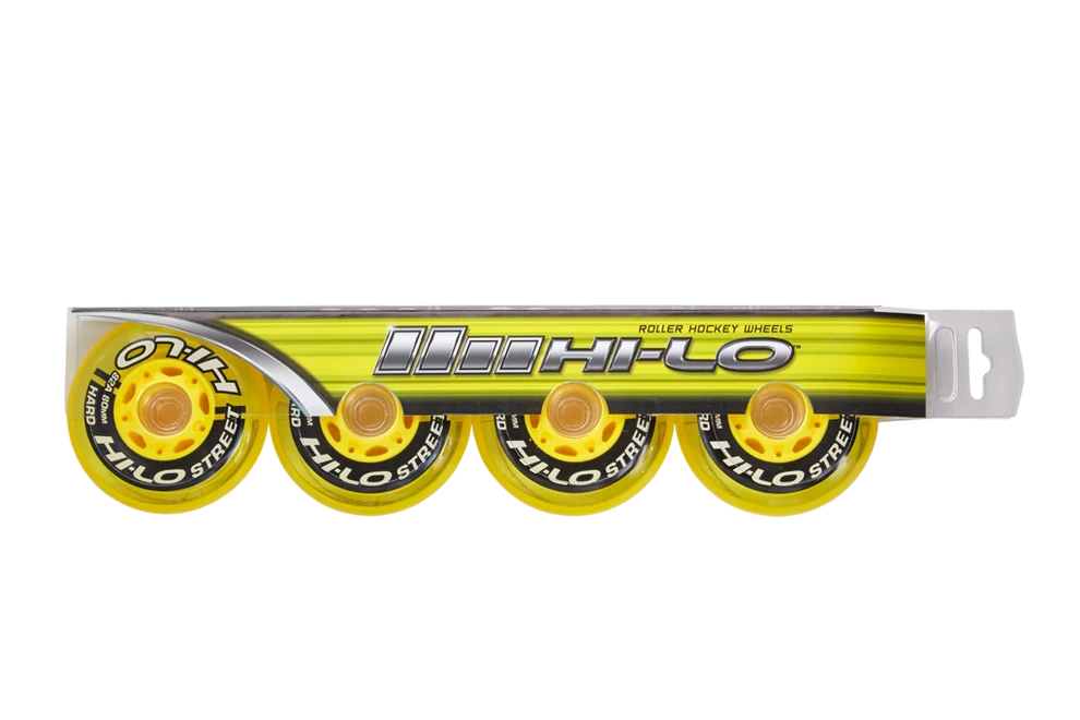 Each model of Hi-Lo wheel is formulated for a unique surface. These yellow Hi-Lo Street wheels are made for outdoor application.